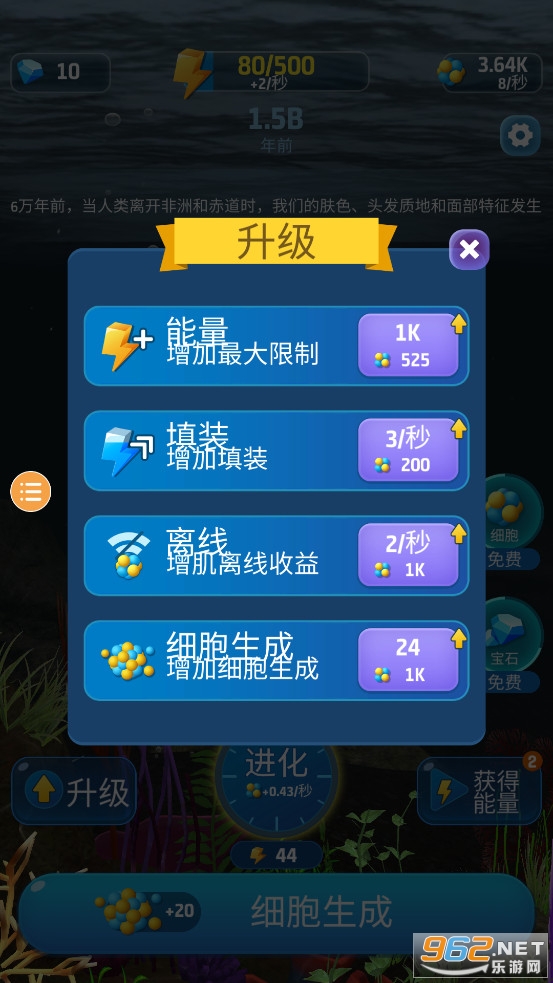 《生命进化游戏》是一款为朋友们打造的模拟从一个细胞进化成为人类的休闲手游,游戏中玩家可以点击进化消耗能量来让细胞一点点的进化,一点点的变成其他的生命,比如最后进化成为人类,当然能量需要一点点的攒积,离线挂机也可以获得奖励。