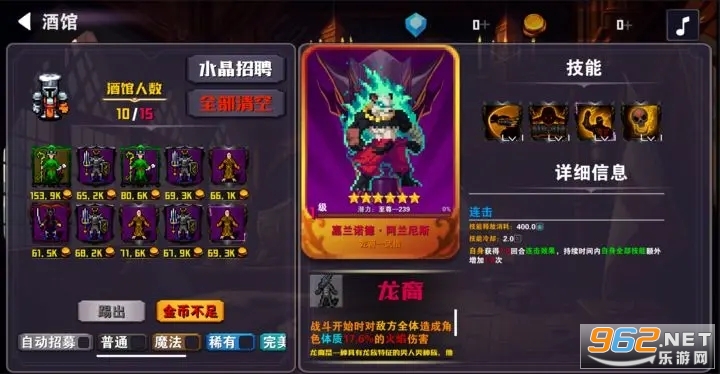 游戏中共有15座地牢等待攻略,完全解放双手的自动战斗,可以边战斗边在城镇中调整队伍和招募新英雄,也可以在铁匠铺打造新装备和建设新领地建筑。