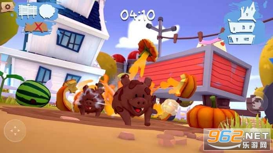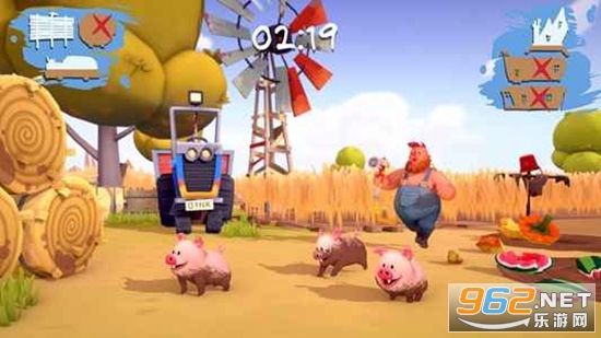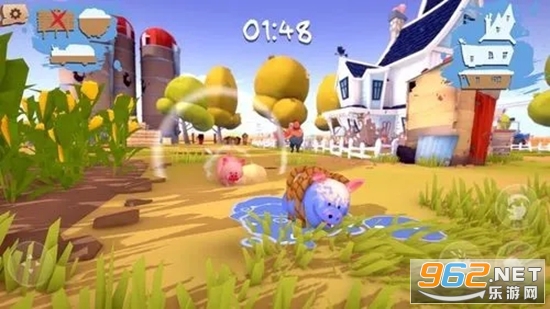 三只小猪逃出栅栏,开始欢快的在泥地上打滚,满身沾满泥巴。当猪的身上沾满了泥巴以后,就可以肆意的往各种东西上甩泥巴了,房屋、拖拉机、广告牌……尽情的弄脏它们就好,甚至……你也可以往帮工身上弄点儿试试?哈哈哈哈,总之这个设定是非常的欢乐,泥巴不够的时候,小猪们可以冲向蔬菜们,比如西瓜什么的,造出一地的泥水来,好可以尽情打滚,沾满泥巴。
