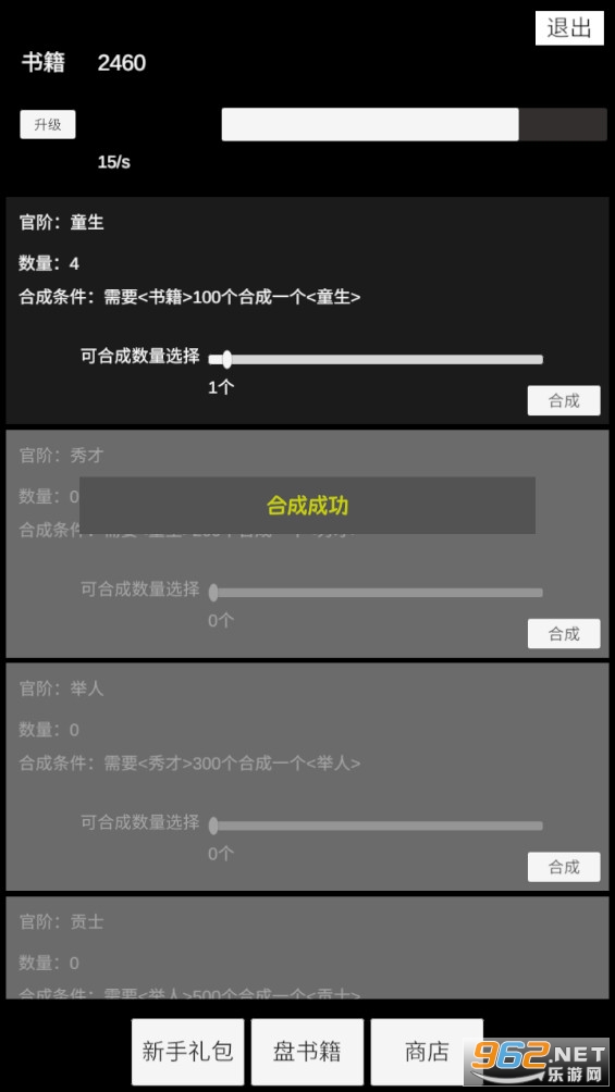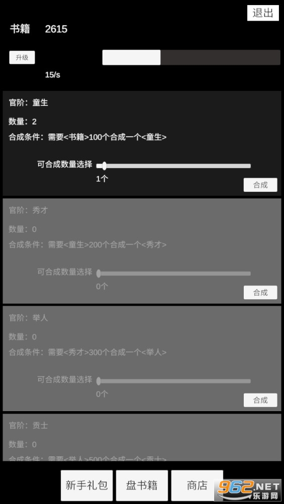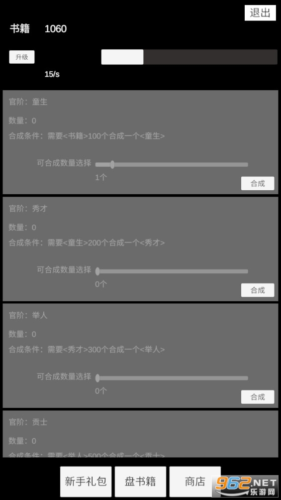 漫漫逆袭路,书籍做阶梯。本游戏是一款文字放置类游戏,通过书籍作为基础,一步步从书生到皇帝的过程。