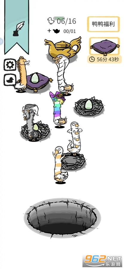 1.简单有趣孵化玩法。玩家只需在场景内稍等片刻,鸭子就会在窝内孵化出鸭蛋,通过点击鸭蛋孵化出更多变异种类的奇怪鸭子。
