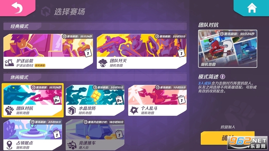 -团队对抗(3v3):组队作战,阵营对抗。总击倒数率先达到20人的团队获胜!