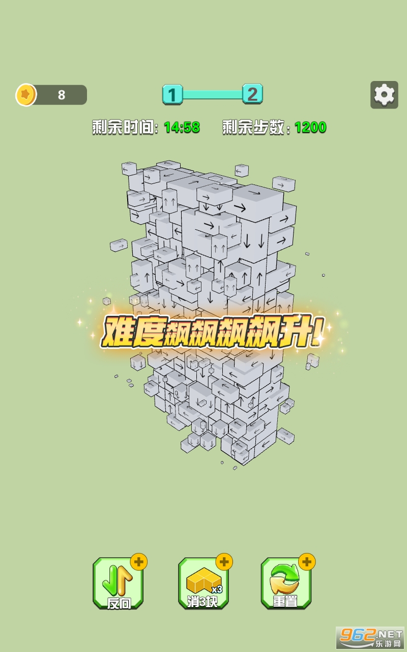 2、当玩家消除的箭头全部相同且在同一行时,将获得高分,不断消除箭头,挑战更高的难度等级;