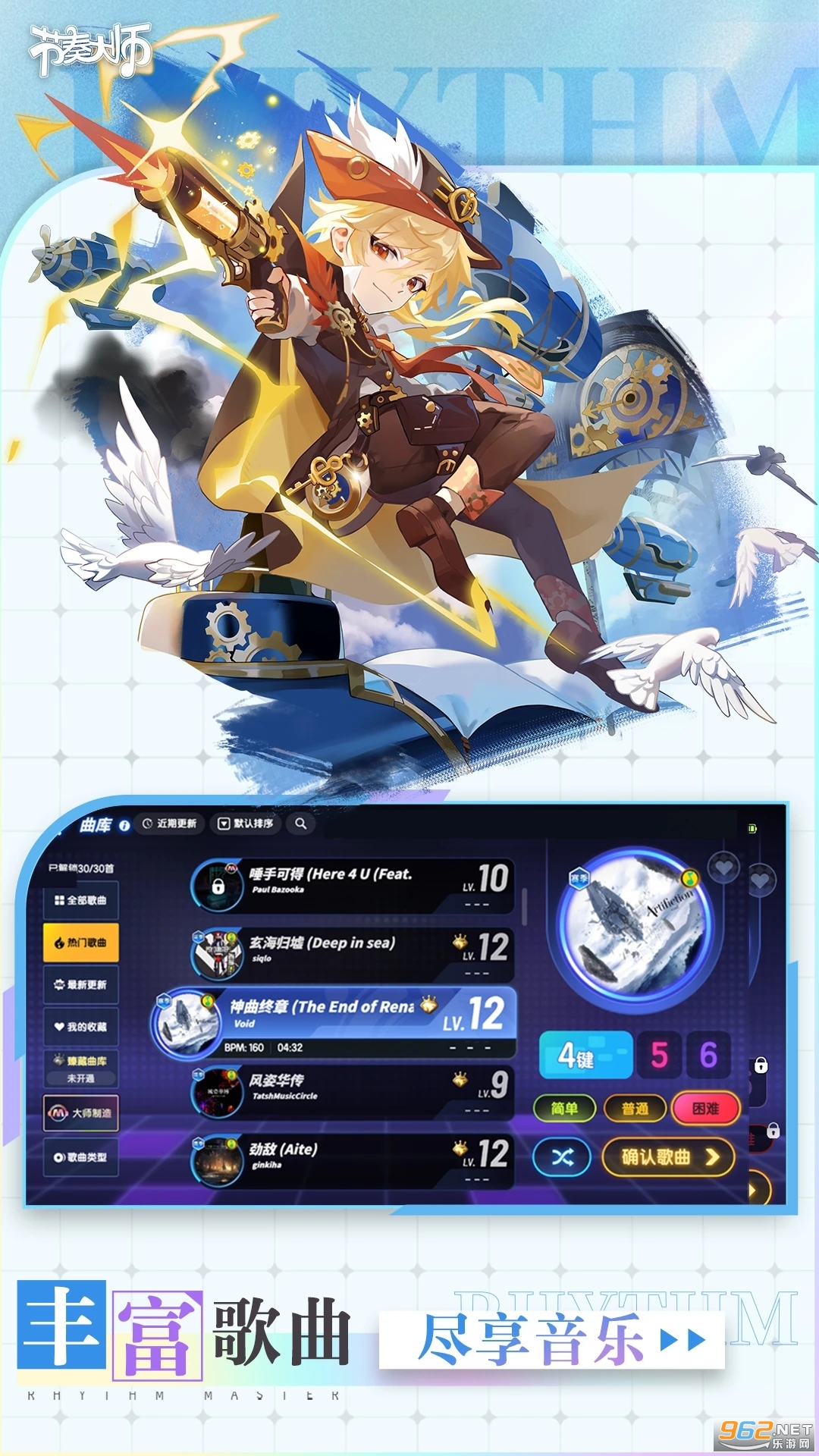 丰富的歌曲类型,包含中文、日韩、动漫、古典等音乐将不断通过网络更新,让您周周都有新歌体验,日日都有新难度挑战!