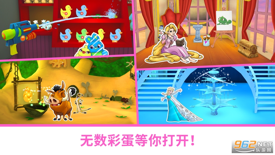 还有更多!一旦角色被着色并装饰,它就会变成贴纸。这些贴纸可以通过标志性的迪士尼地点放置在神奇的3D世界中,孩子们可以演出自己的故事并发现隐藏的互动惊喜 - 在他们的创意游戏中增加了魔术的散布。