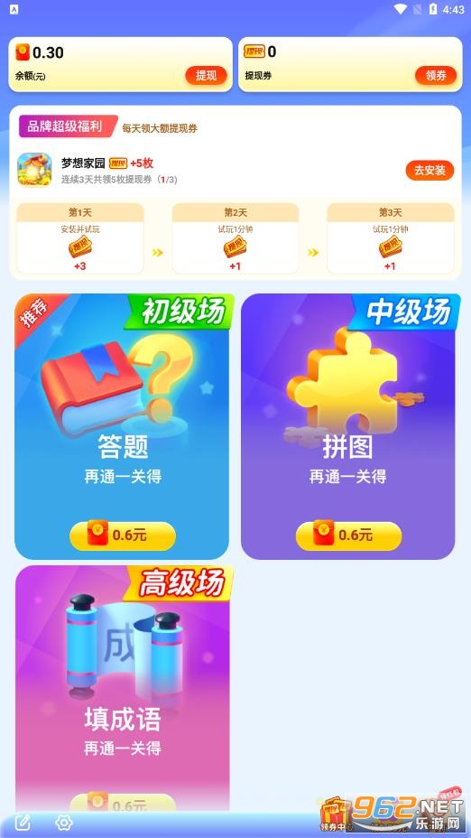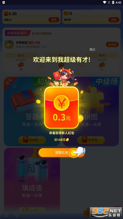 《我超级有才红包版》是一款趣味答题领红包的平台,在这里玩家可以通过答题,拼图,填成语三种玩法在这里答题领红包,每答对一题,完成一个关卡可以领取0.6元陷阱红包,上线还能领红包,支持提现,操作简单,方便,既可以打发时间,又能够赚钱哦!