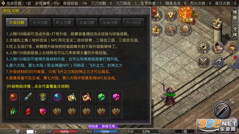 新人上线选择职业后赠送经验勋章,拥有杀怪经验倍数与免费随身泡点属性,勋章等级越高升级越快,泡点最高可升到150级,打怪最高可升到5000级。
