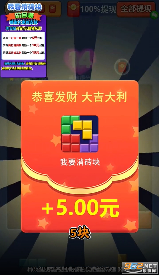 进入关卡进行消除挑战,拖动不同形状的砖块,进行消除,完成相应的任务,即可获得红包奖励。