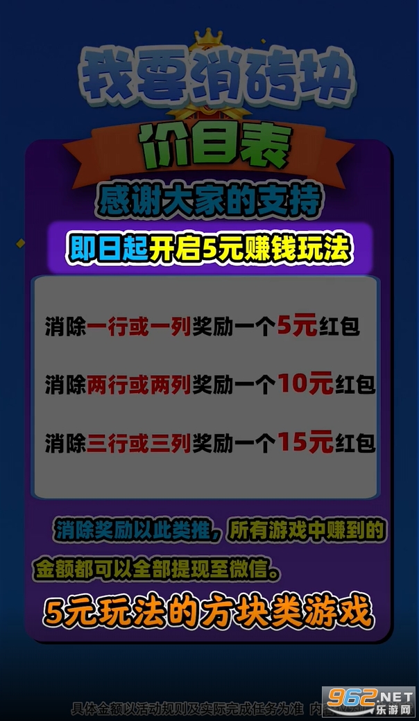 总体来说是一款玩起来非常不错的趣味休闲闯关游戏,整体的玩法还是很简单的,经典的方块消除的玩法,加入了赚钱的玩法,喜欢的亲们赶紧下载吧。