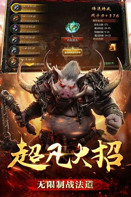 3、永久至尊:购买永久至尊 赠送稀有称号,每天可免费领取30000威望,每天免费挑战至尊特权BOSS(百倍爆率),一键扫荡个人boss,一键熔炼背包装备...彻底解放双手,更多特权等你来体验!