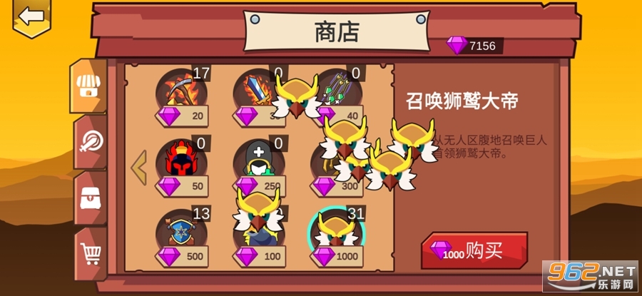 大型武器(军械库),能够增加你单位的火柴人战斗的力量:矿工更努力,剑客狂暴,治疗师,雨箭,矛疯狂,金矛,雕像炮塔,狮鹫。