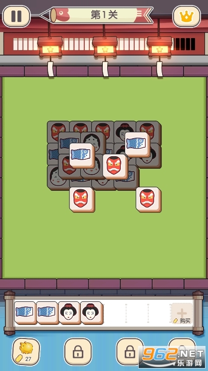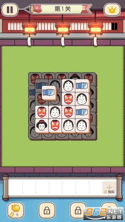点击榻榻米上的方块进入下方收集槽中,三个相同的方块会自动消除~
