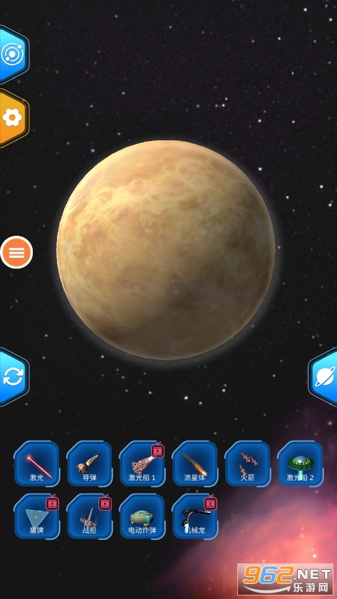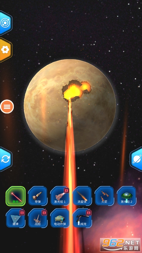 游戏提供许多武器:导弹、炸弹、流星、小行星、能量束、宇宙飞船、战争机器,让你摧毁一个星球。