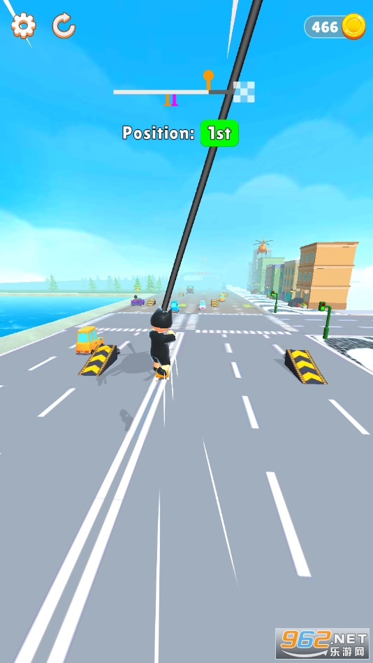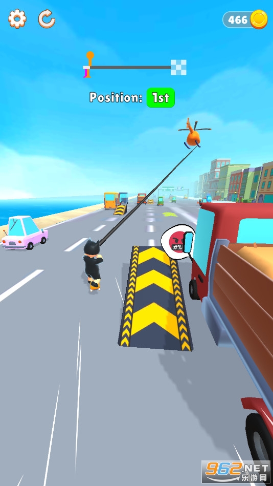 扔出你的绳子,钩住汽车、标志或直升机,然后从一个跳到另一个,快速完成。 注意障碍物和交通。 享受您的超快滑板之旅!