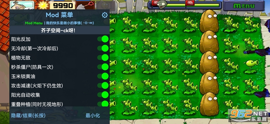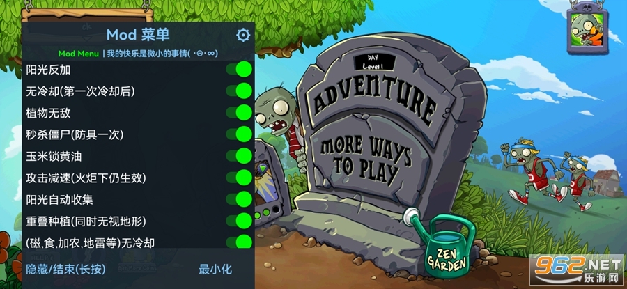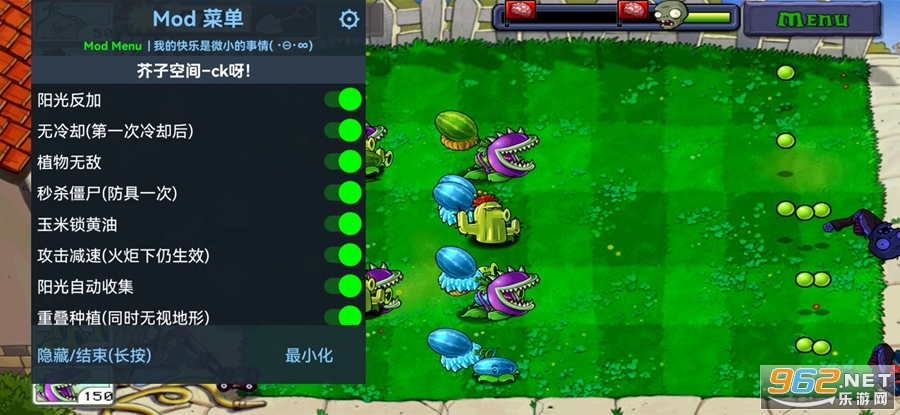 提供植物大战僵尸内置功能菜单下载,可重叠种植无冷却无限阳光,无限金币等,可以自由开启想要的功能,《植物大战僵尸》(Plants vs. Zombies FREE)是一款非常好玩的塔防游戏,玩家可以使用窝瓜、食人花、玉米等来消灭僵尸,有着多种模式众多的关卡可以挑战。