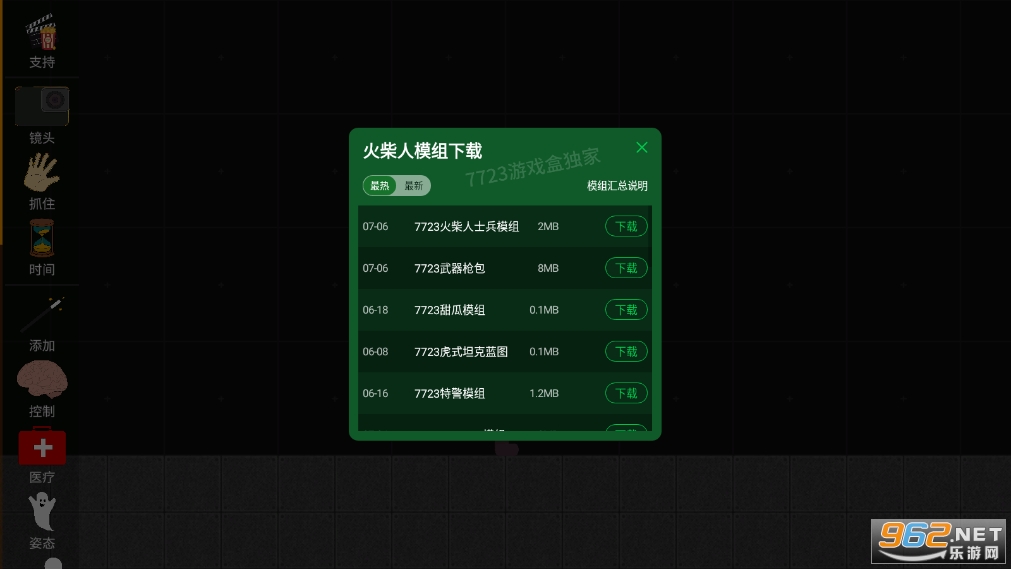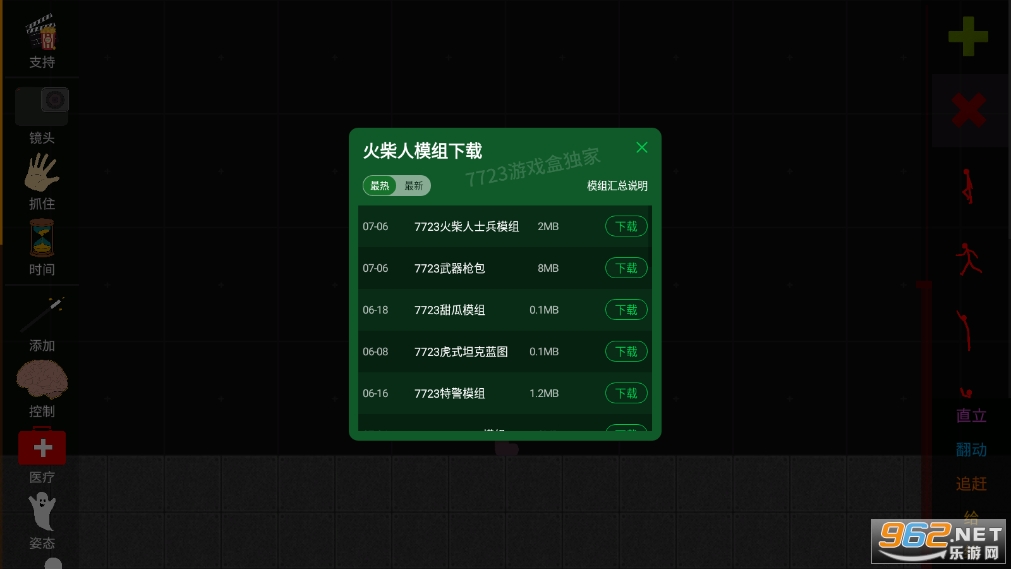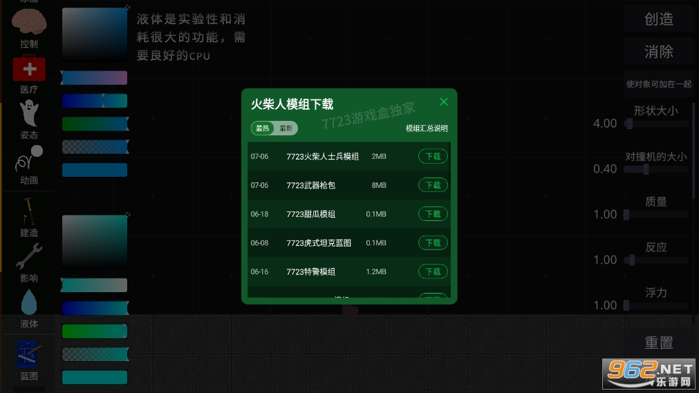 比较好玩的一款模拟游戏,玩法比较的自由,轻松,里面的道具很丰富,你可以想用啥就用啥,自由的构建出不同的场景,使用丰富的道具,火柴人角色等待,尝试有趣的实验,尽情的在这里发泄压力!