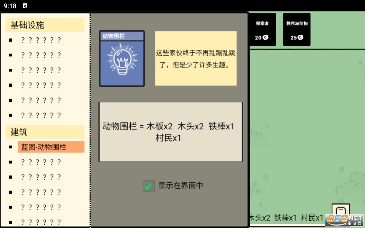 堆叠2张木板、2张木材、1张铁锭和1张村民,来建造动物围栏
