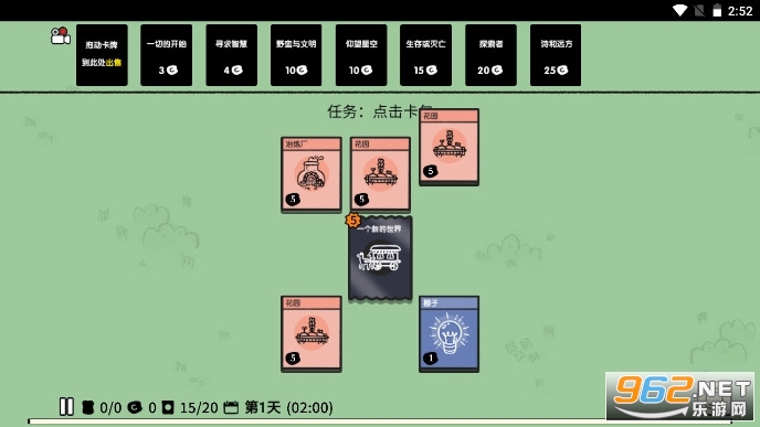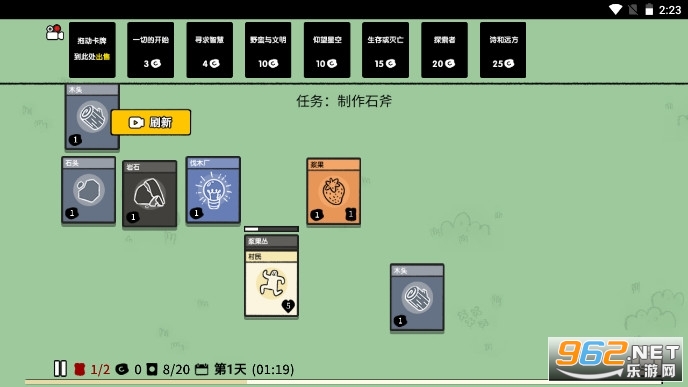通过寻找创意卡来扩展你的知识。思想卡会告诉你如何创造新的卡,例如:堆积2个木头、1个石头和1个村民来建造房子。