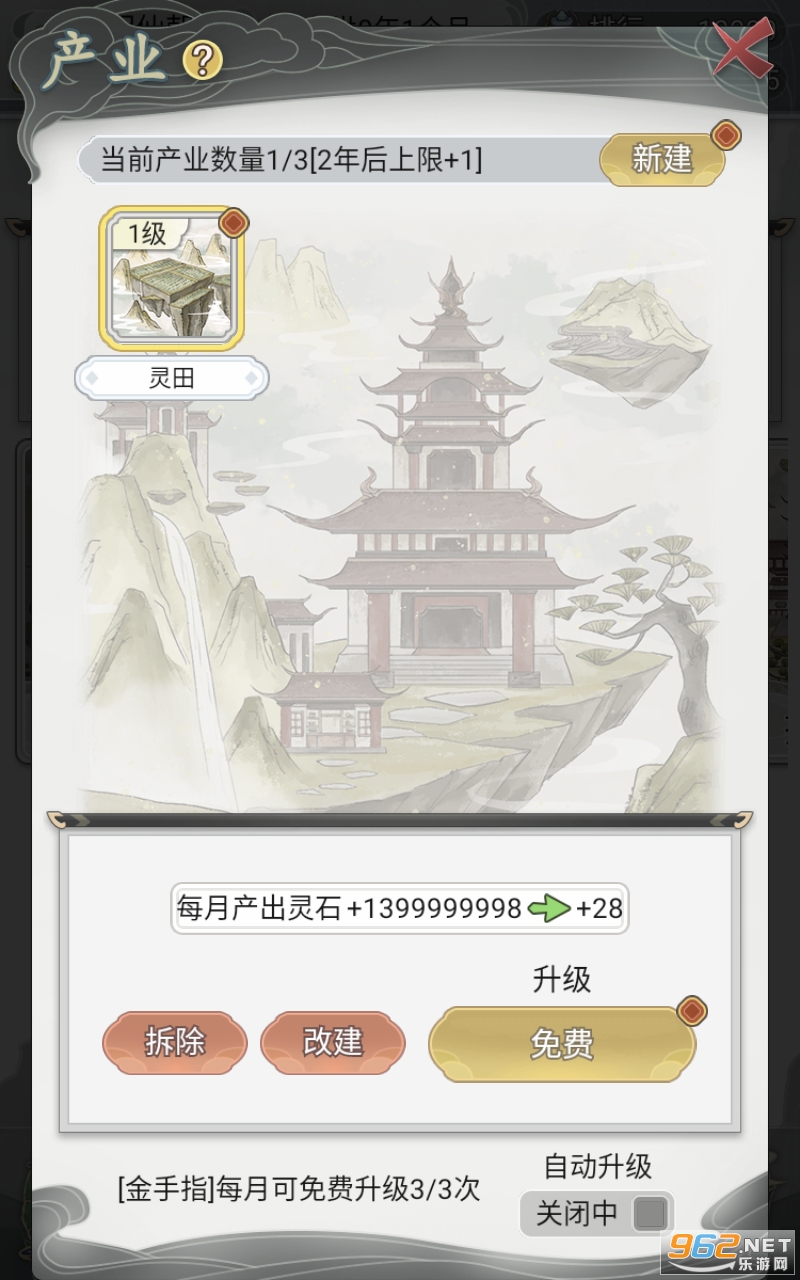 秘境每月刷新,炼丹房100%,一级灵田加大量灵石,悬赏台功绩加999