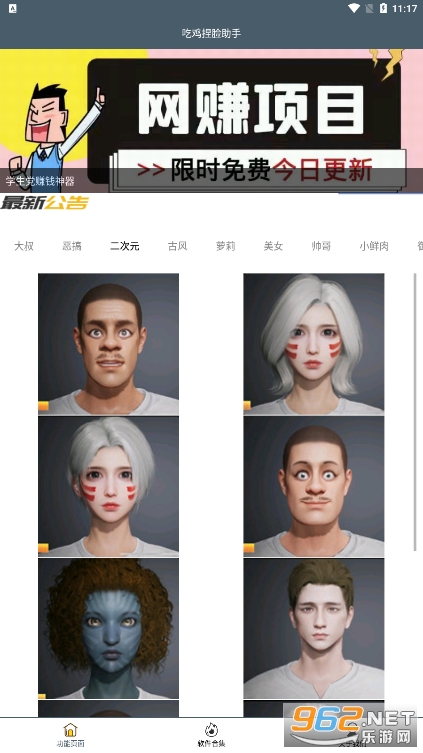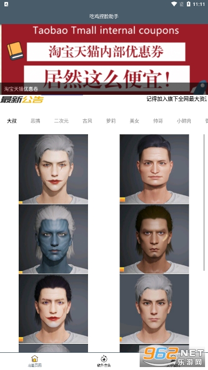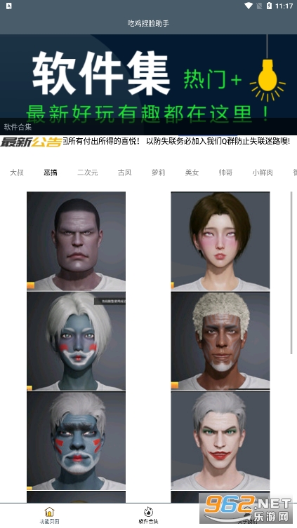 《吃鸡捏脸助手app》是一款游戏辅助捏脸的工具。里面有大叔,恶搞,二次元,古风,萝莉,美女,帅哥,小鲜肉等不同类型的脸部代码,玩家只需要选择你看中的脸型,点击图片,即可复制代码,进入吃鸡游戏里面粘贴代码,即可生成想要的人物外观,成为吃鸡里面最靓的仔!