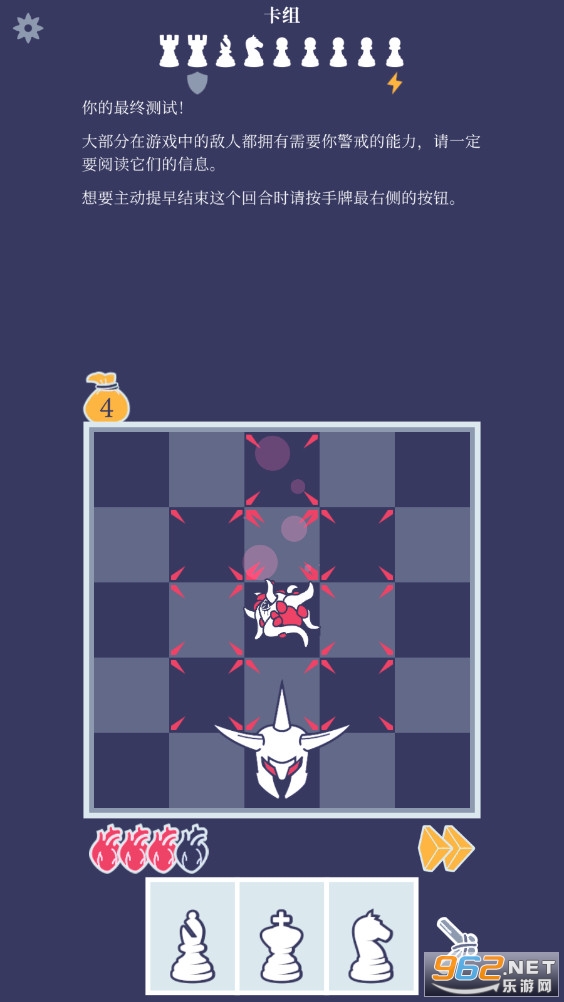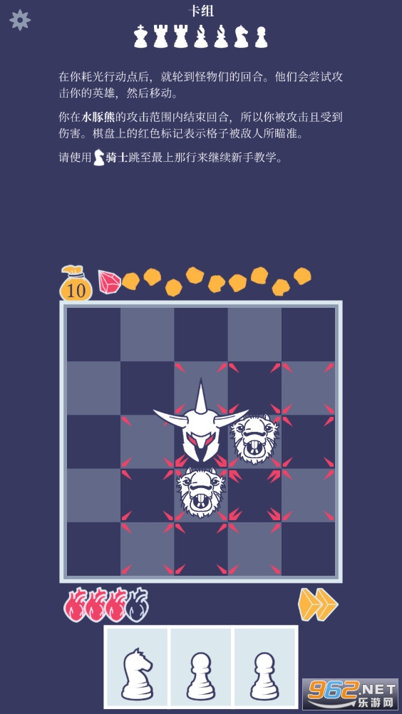 《瓦里安走卒Pawnbarian手机版》是一款有趣的策略益智地牢冒险游戏,游戏中你将获得以国际象棋棋子的卡组,打出卡牌你的角色将以棋子的方式在棋盘中移动,你需要通过这种方式来消灭所有的敌人,付费解锁完整版。