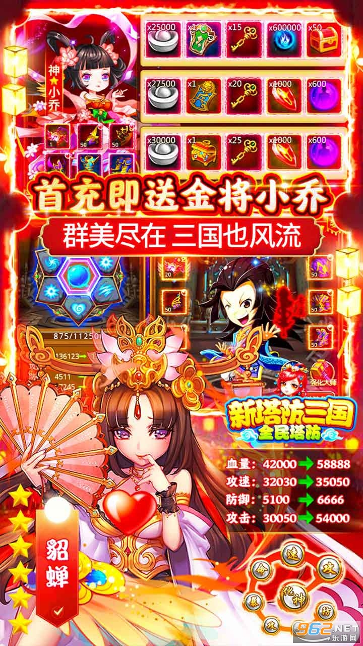 《新塔防三国》:上线赠送贵族15、元宝66666、银两50万,还有万元充值卡,贵族福利天天领,每天道具免费抽,一直白漂一直爽。