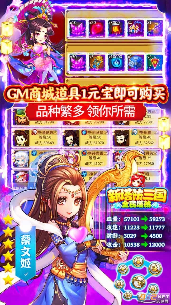 连续登录送核心金将,出门推图、呆家守塔必备良药,策划良心发现,神将招募拼死暗改,5次10抽必出金将,10次10抽必出神将,再也没有抽卡烦恼,GM商城价格全是1元宝,道具品种繁多,价值不菲的道具就这样双手献上了。一款萌系的塔防手游,将三国历史上叱咤风云的人物,变化为一座座有爱的防御塔。