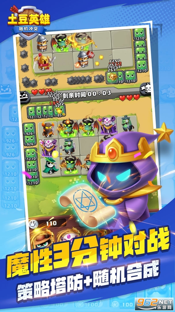 随机冲突土豆英雄这款游戏属于塔防类游戏,但跟普通塔防游戏不同的是,这款游戏最吸引人的地方就是随机玩法,玩家战斗时只能带5个英雄,每次随机召唤五个英雄中的一个上场,每个英雄上场的站位也是随机的,另外两个同等级且同样的英雄可以合成高等级的英雄,合成的英雄也是随机的。这种随机的乐趣更高,游戏的可玩性也更强。