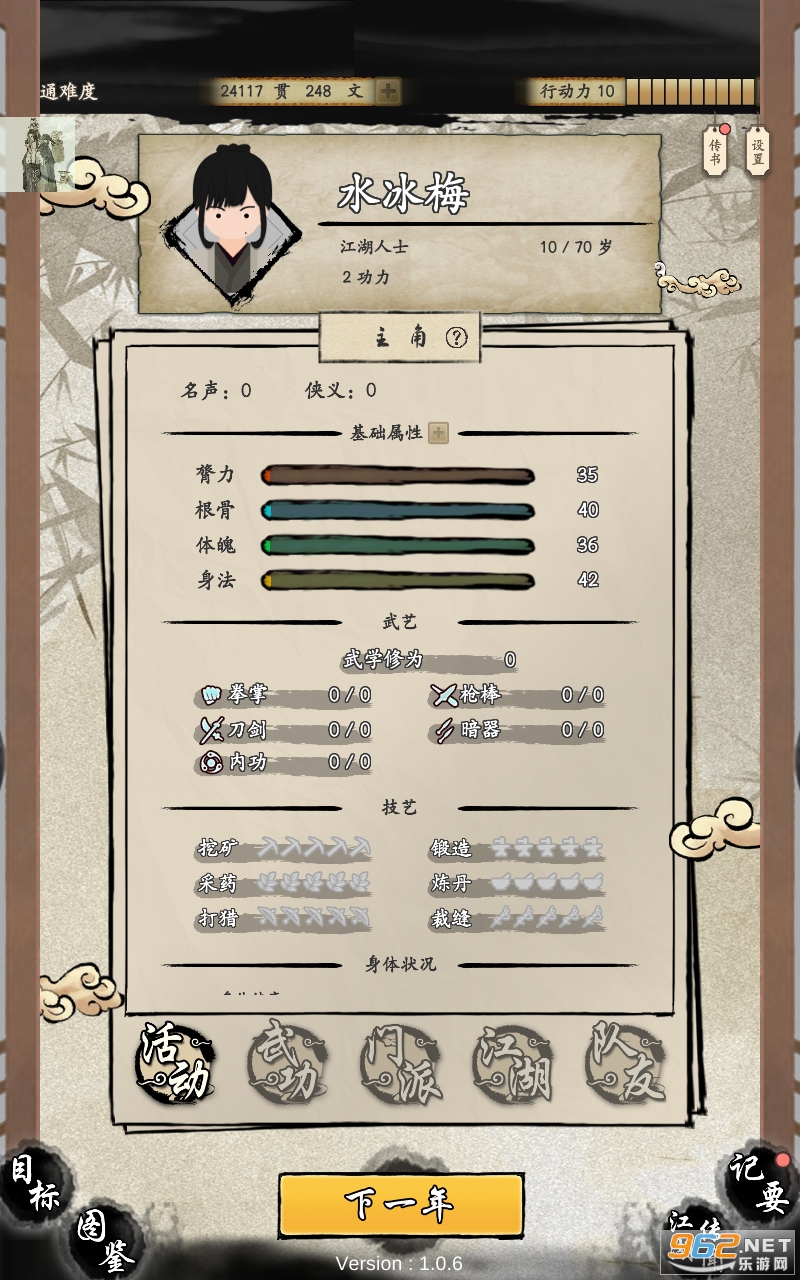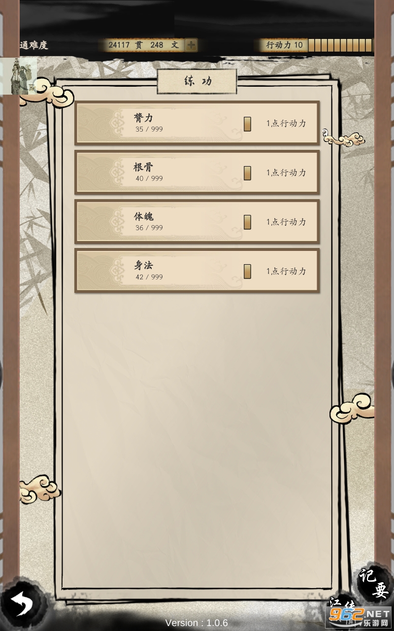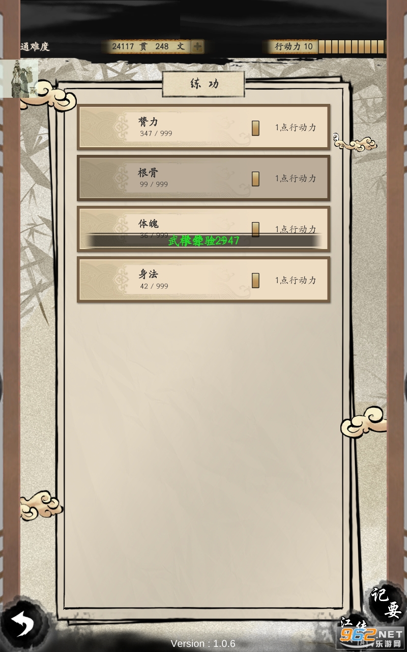 2.开局练功:因为属性越高,练功收益越低,所以四项属性要平均练。其中根骨和体魄可以高一点,因为早期武功加臂力和身法比较高。拿到手的白色最垃圾武功学会之后保持0级不要练,到18岁结束前直接学满。因为18岁结束后会给你安排一场战斗训练,要赢就要练武功。19岁的时候就只练四项属性最低的那个,之后就闯江湖不再需要练功了。