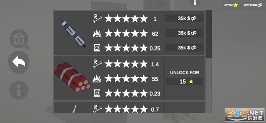 趣味的物理破坏游戏,有着众多的建筑可以解锁体验,选择自己喜欢的武器去击毁各个建筑,发泄压抑的情绪,游戏已破解,有着大量的星星和钞票可以免费使用,喜欢的朋友可以下载试试。