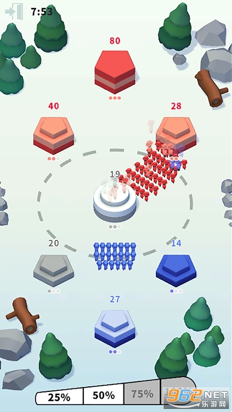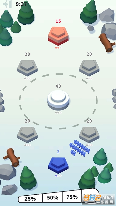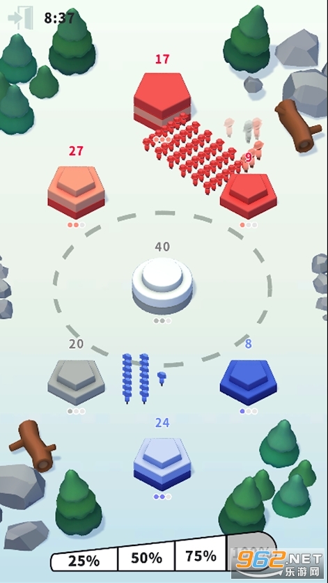《塔之战war of Towers游戏》游戏中你将会化身为红、蓝、绿、黄中的一队,你要不断消灭更多的对手并占领更多的地盘才能够取得最终的游戏胜利,每次派兵进攻之前搞清楚地对手的具体动向,便于及时增员保证后方不会被攻陷。