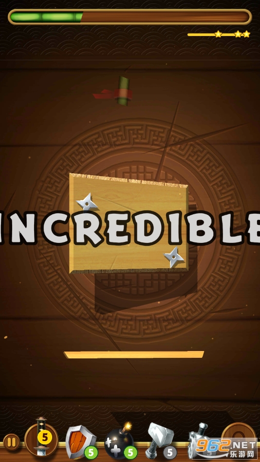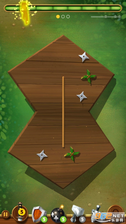 能在游戏中运用各种道具,让游戏变得轻松简单。屏幕下方的一排道具都各具特色,暴风闪电可以去除木板上指定的金属边框。炸弹图标的道具则可以消除一个飞镖,降低游戏难度。另外,在切木板的过程中,也会随机掉落出一些道具需要玩家及时手动拾取