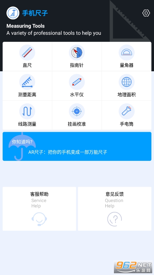 手机尺子还支持AR尺子(部分版本不支持),量角器,测量距离,测量面记,水平仪,手电筒,指南针等多种功能.