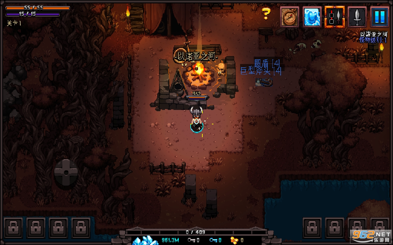 虽说是像素风格,但是画面的表现力一点也不差,游戏采用了 3D 建模的像素风,通过 45 度的俯视角将整个区域展现在玩家面前。火把燃烧时光线的明暗变化,树枝和草垛的摆动,还有泛着微光的湖水,即便是在这样一个看似粗糙的画质下也能体验到真实的动态视觉。