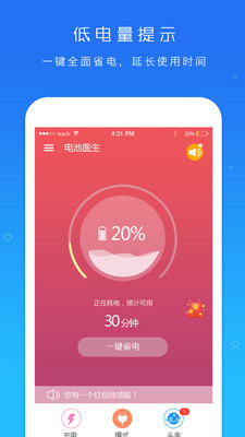 监控应用程序的耗电情况,并及时提醒用户耗电量异常的应用程序。当用户使用一键省电功能时,给用户量化当前操作能够延长的电量使用时长。监控统计应用程序的耗电量,并通过应用程序管理器展示给用户一个详细的应用程序榜单。当电池电压过高、温度过高时会发出声音警告,有效防止手机电池爆炸。