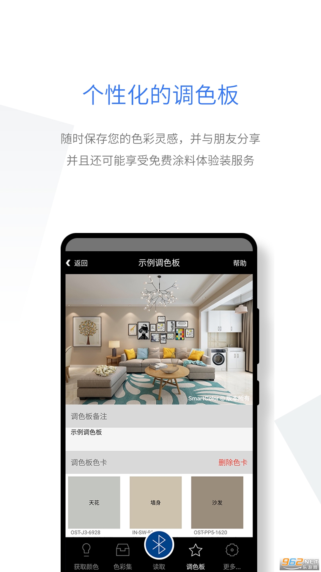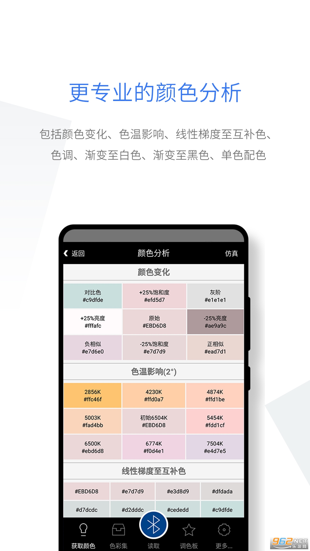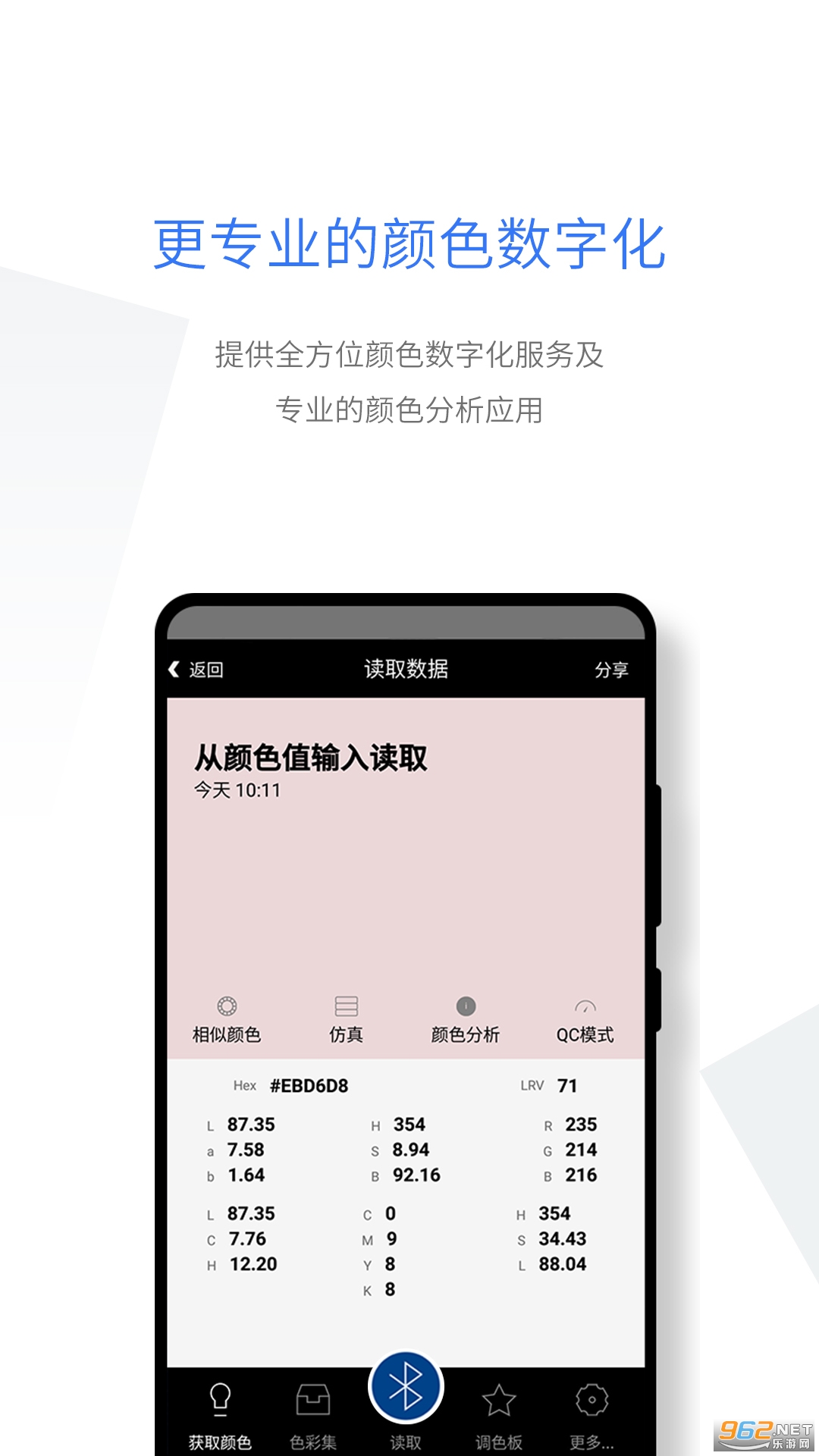 支持取色仪取色,一点即可获取实物颜色。APP支持著名色彩提供商DataColor生产的取色仪联机一键获取实物颜色