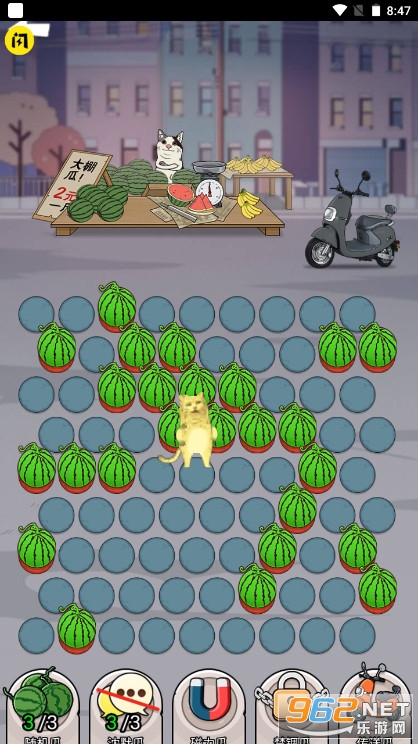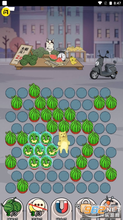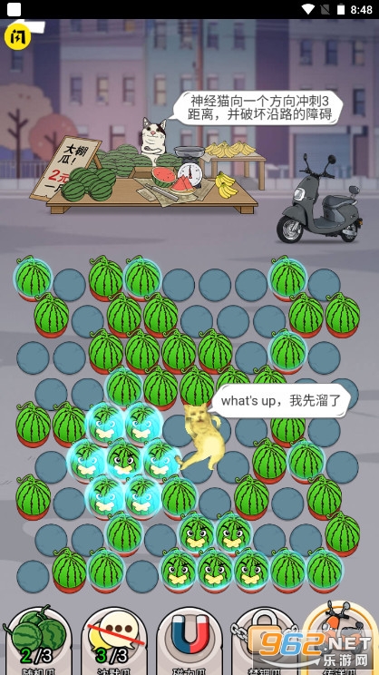 《神经猫大招版》结合了时下比较出圈的华强买瓜、今年豹富等网络热词所打造,玩家将化身成为一只骑着电瓶车的金钱豹去到神经猫的瓜摊上买瓜,利用场上的道具合理的进行布置,将神经猫原有的瓜摊团团围住,即为最终的游戏胜利,相当的有意思。