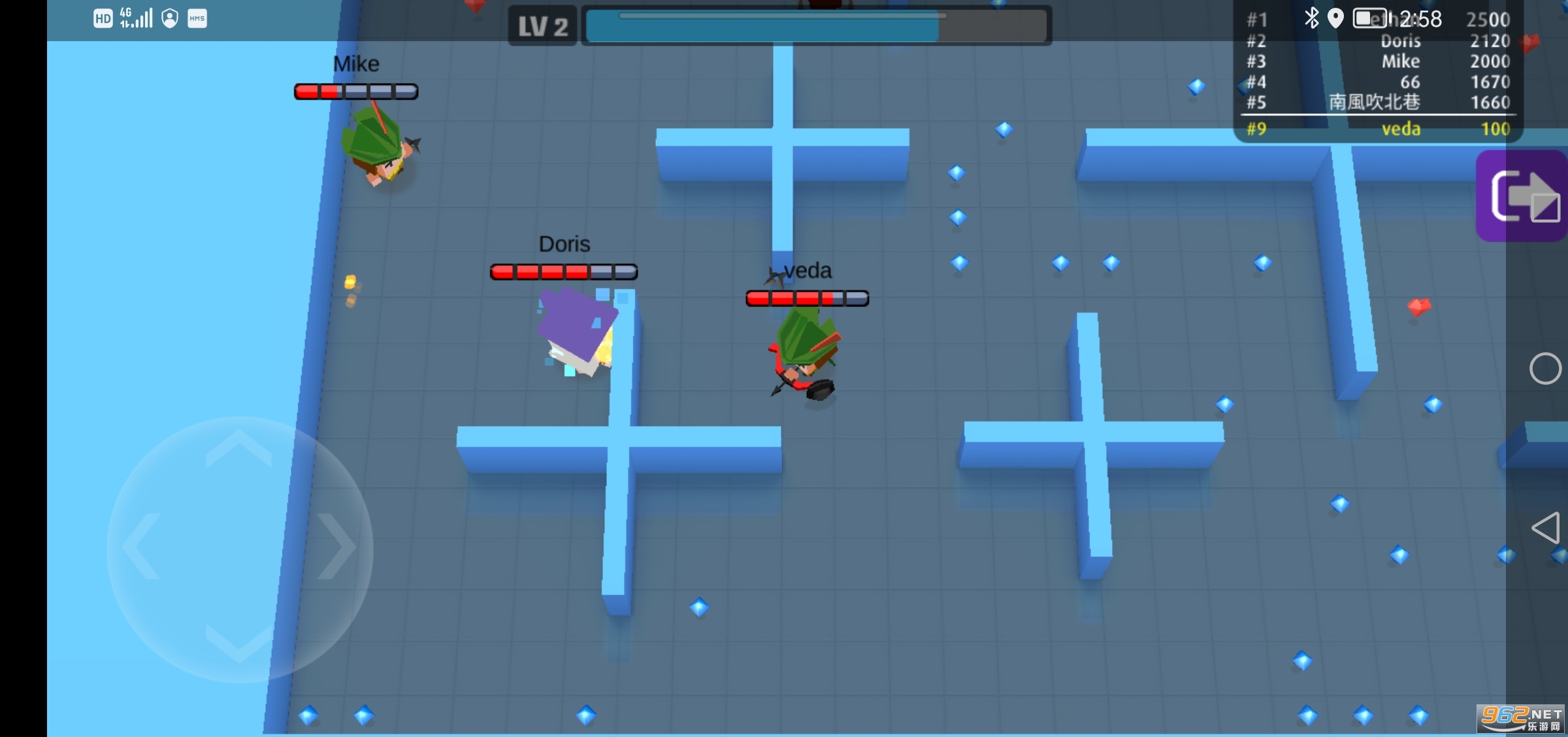 1.通过虚拟摇杆控制走位,利用手中的弓箭击败对手;