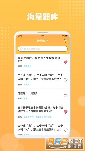 趣问大全红包版是一款非常好有意思的答题小游戏。趣问大全APP有海量的题目等大家前来挑战,通过趣味的问答方式进行练习,让你了解更多的知识,趣问大全游戏还可以选择将感兴趣的题目收藏起来,随时都可以查看,回顾自己回答过的问题,了解自己的答题情况。这款趣问大全能够帮助大家拓宽自己的知识局面,让你收获更多的知识。