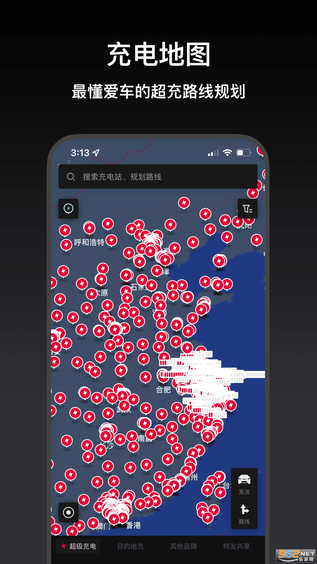 集合了特斯拉超级充电桩、目的地充电桩、国标充电桩,信息准确靠谱。一键查看可供住宿的充电桩。