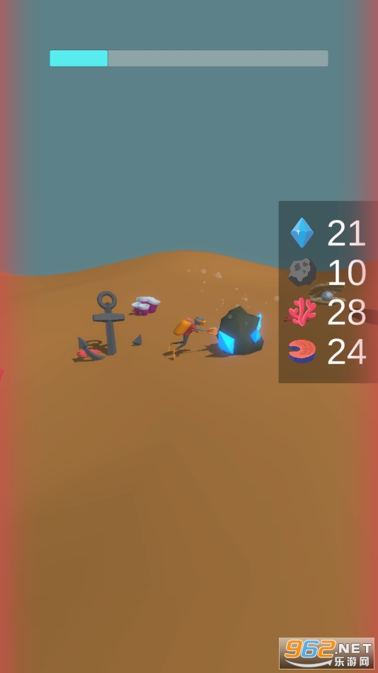 1、随意滑动屏幕控制潜水员在水下移动,探索各种矿物或宝藏,躲避鲨鱼的进攻;