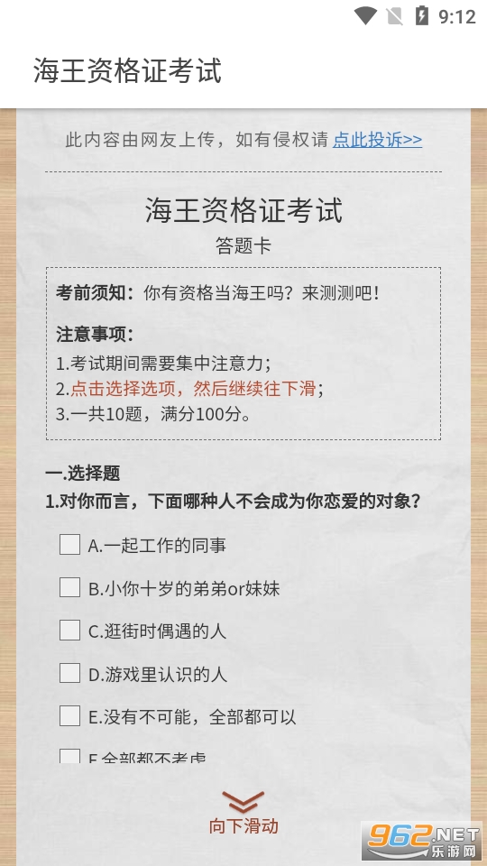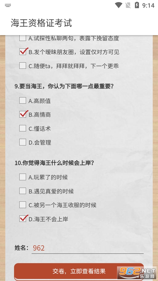 《海王资格证考试》是最近比较热门的能够测试你的海王资格的游戏,通过回答问题之后就能够得到海王资格证了,看看你的海王水准到了哪个级别,一共十道题,很快就能做完,对于小编来说全部都是送分题,给大家看看海王资格证考试满分图片,另外下面附上了海王资格证考试答题答案。快来试试吧!