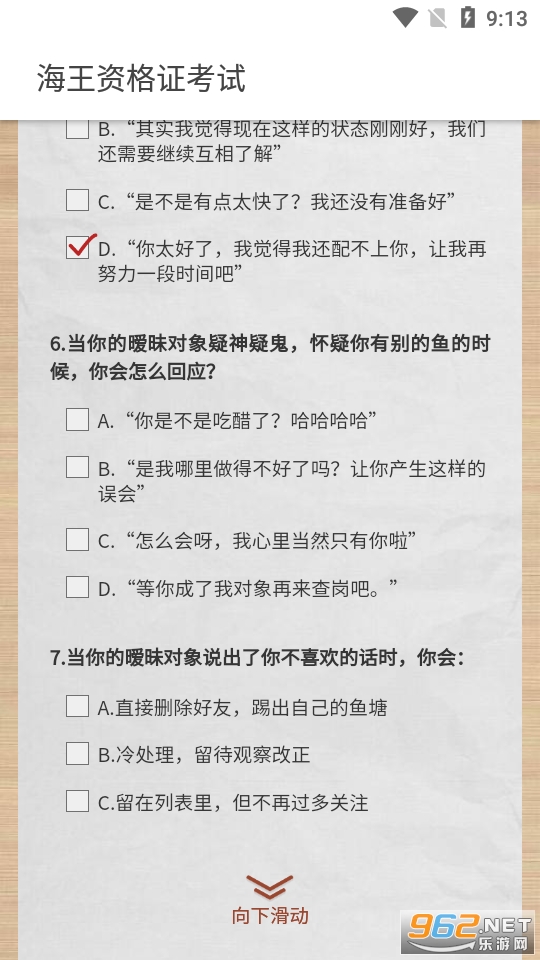 非常有意思的一款游戏,快来看看在海王测试证中你能够得到多少分吧,小编可是能够答对所有问题答案的顶级海王,快来尝试一下吧!