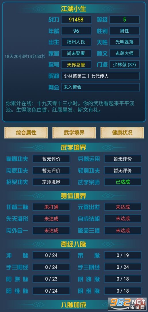 8、未成为宗师的玩家,必须要《招架功夫》到宗师境界才能成为武学大宗师。
