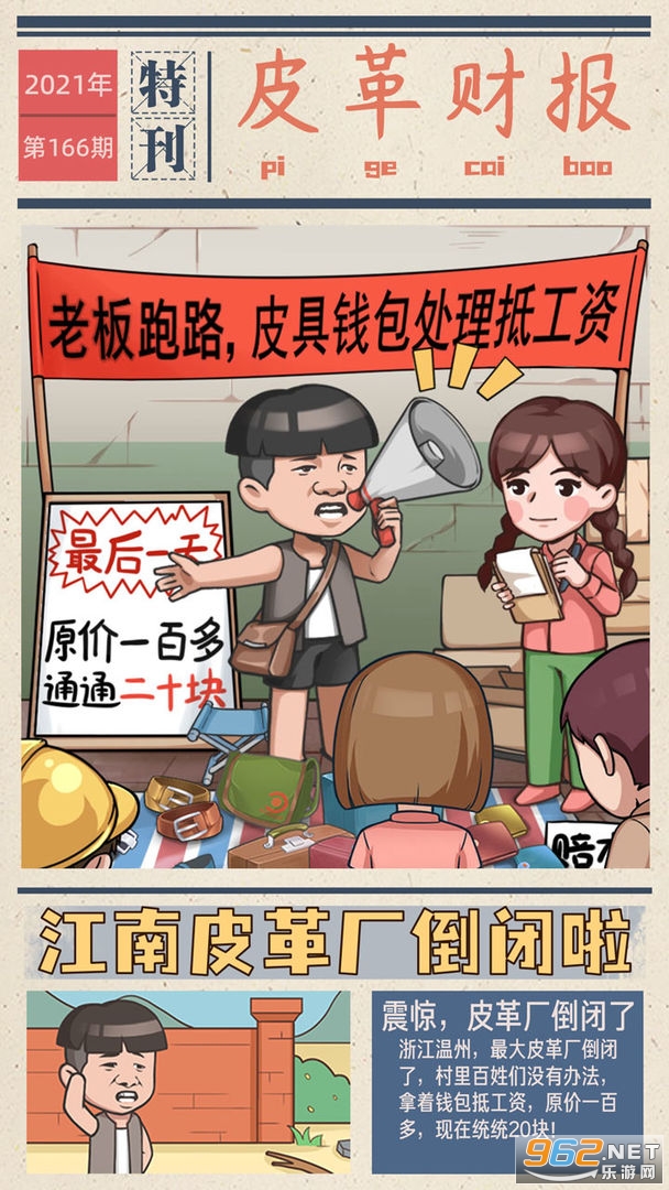 《我的江南皮革厂安卓版》这款游戏的背景年代是上世纪九十年代,村里面唯一的工厂倒闭了,之前一直在工厂工作的乡亲们一下子失去了工作,并且工作一年的薪水还没有拿到,所有人的日子都非常难过,现在你需要去接手这家工厂,并发展皮革生意,带领乡亲们走上致富的道路。