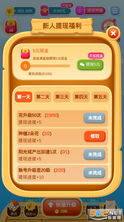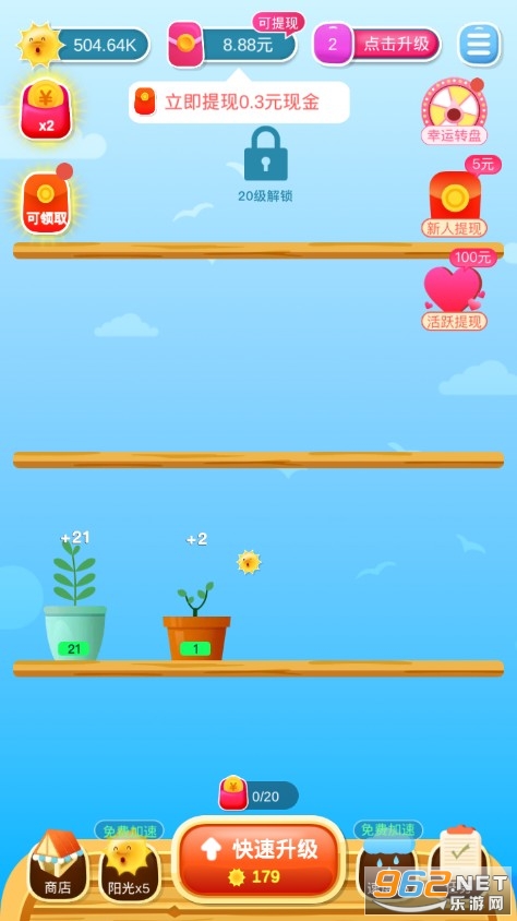 《欢乐养花赚多多》是一款能赚钱的模拟经营种花游戏,线上云种花做任务赚现金,动动手指就能完成任务,每天记得领取阳光和植物种子,并耐心的将种子培育到盆栽中,还要为它们施肥浇水,手指快速点击升级植物,达到一定等级就可以获得红包奖励了。