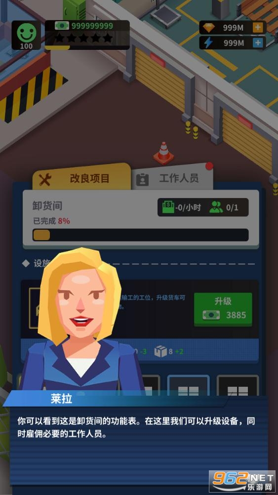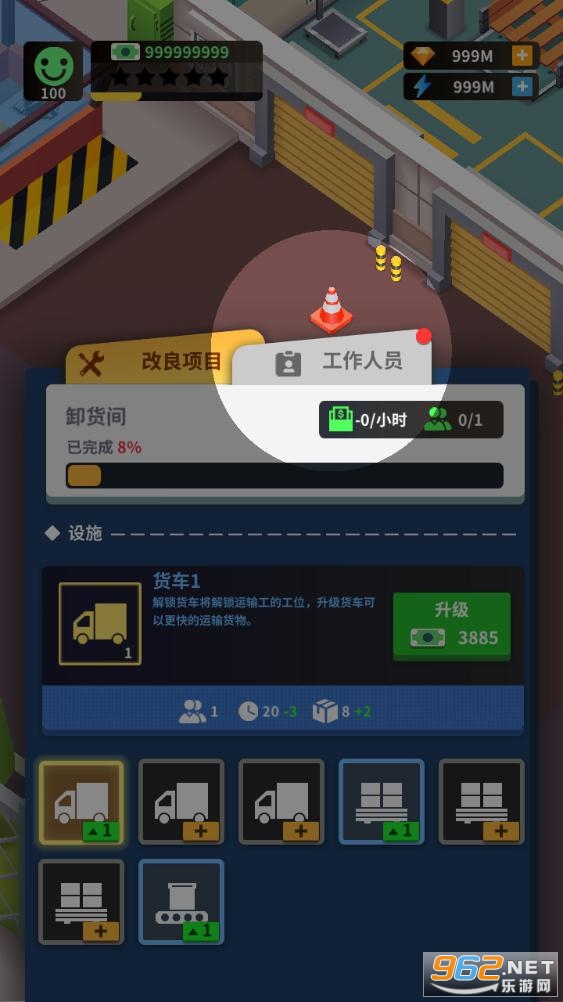 稳步扩展您的业务。购买更多的卡车和机器,以提高运输能力和生产效率。同时,要招聘和培养员工,其中精英人才是最有能力的。每个人都有不同的技能。发挥他们的优势,优化您所有的车间和部门!