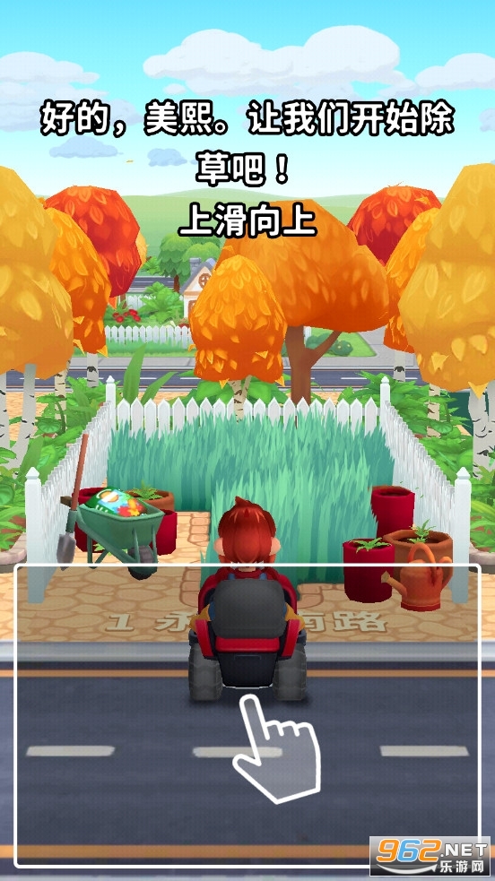 引导你的割草机在郁郁葱葱的花园和迷人的房子周围移动;不留下未修剪的草叶。