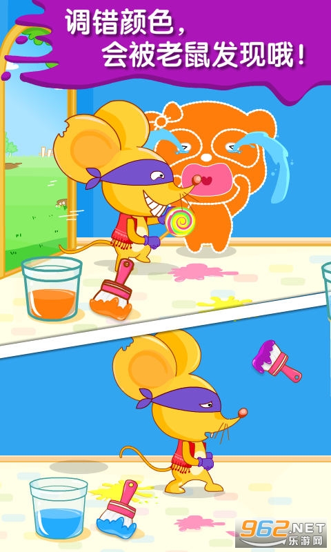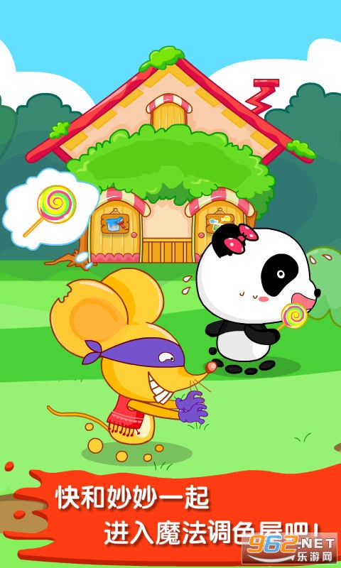 宝宝们快点来宝宝巴士的宝宝调色屋帮助熊猫妙妙吧,贪吃的老鼠要抢走妙妙的棒棒糖啦,快利用不同颜色混合变色的力量来帮助妙妙吧!