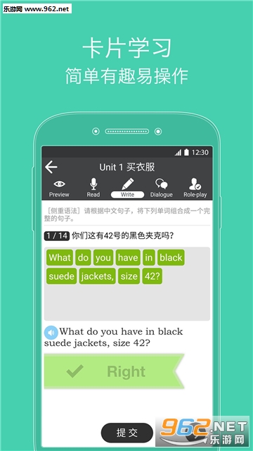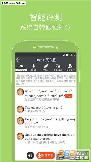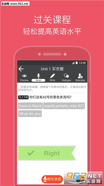 软件的每个学习内容都带有巩固练习的板块,学习者可以及时自测学习效果,同时内置口语实景对话跟读联系,配合全新语音评估技术,给你的口语实时评分,无需联网照样识别。
